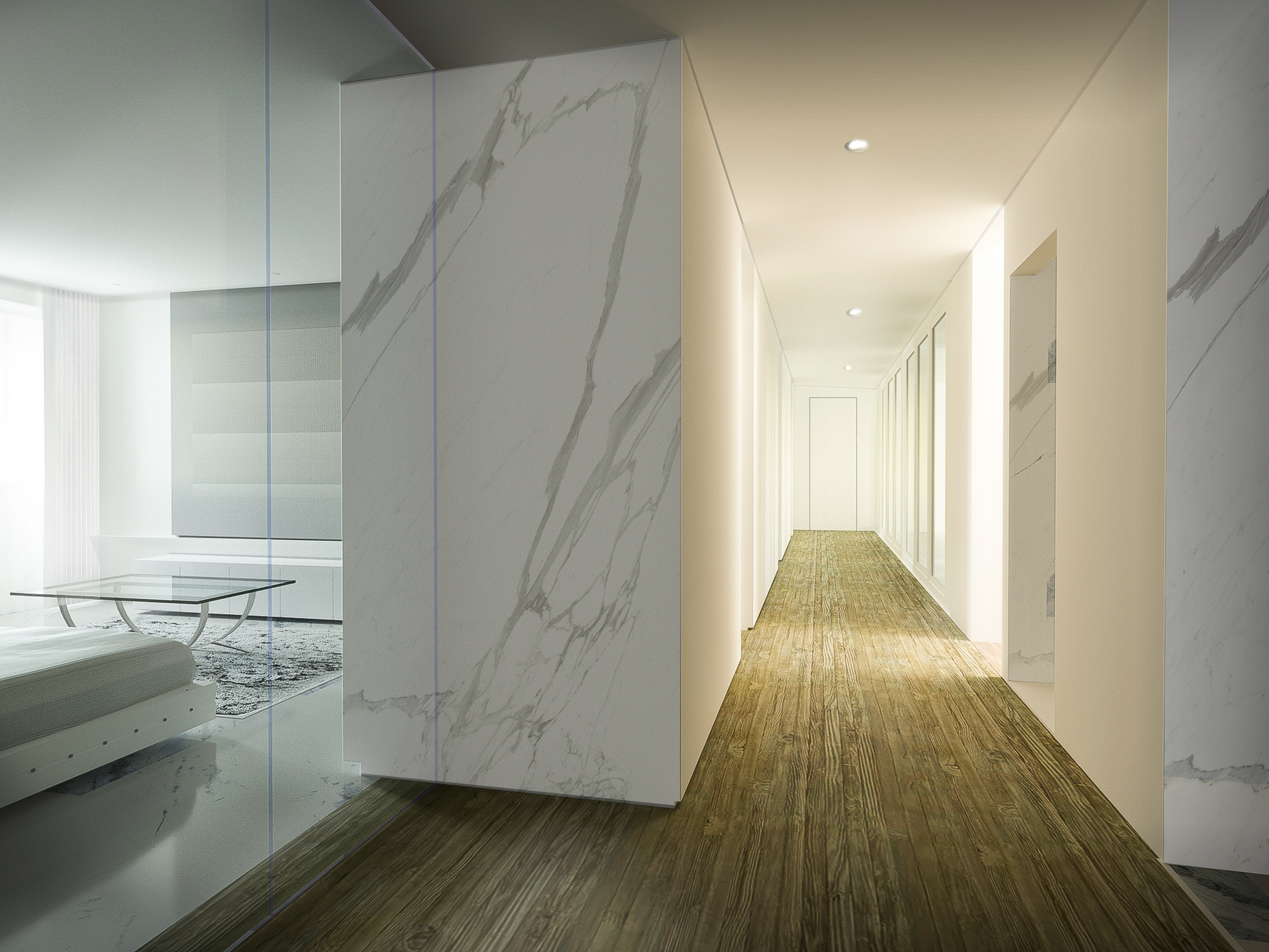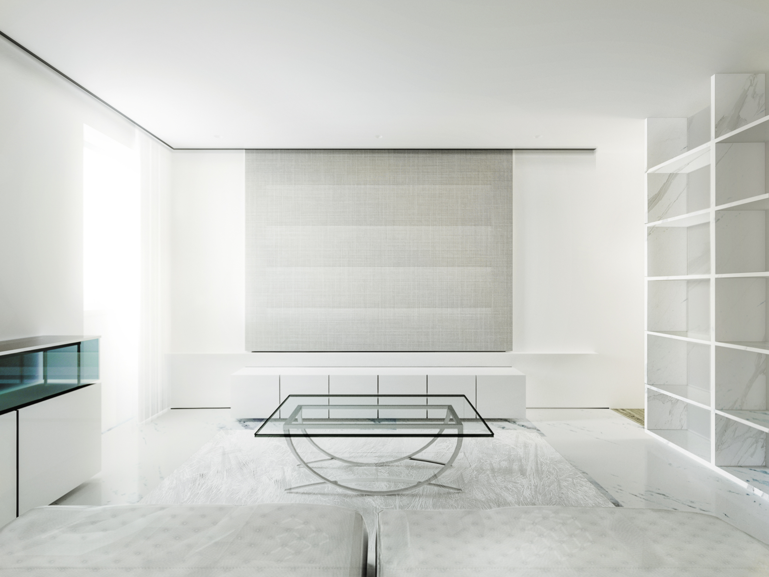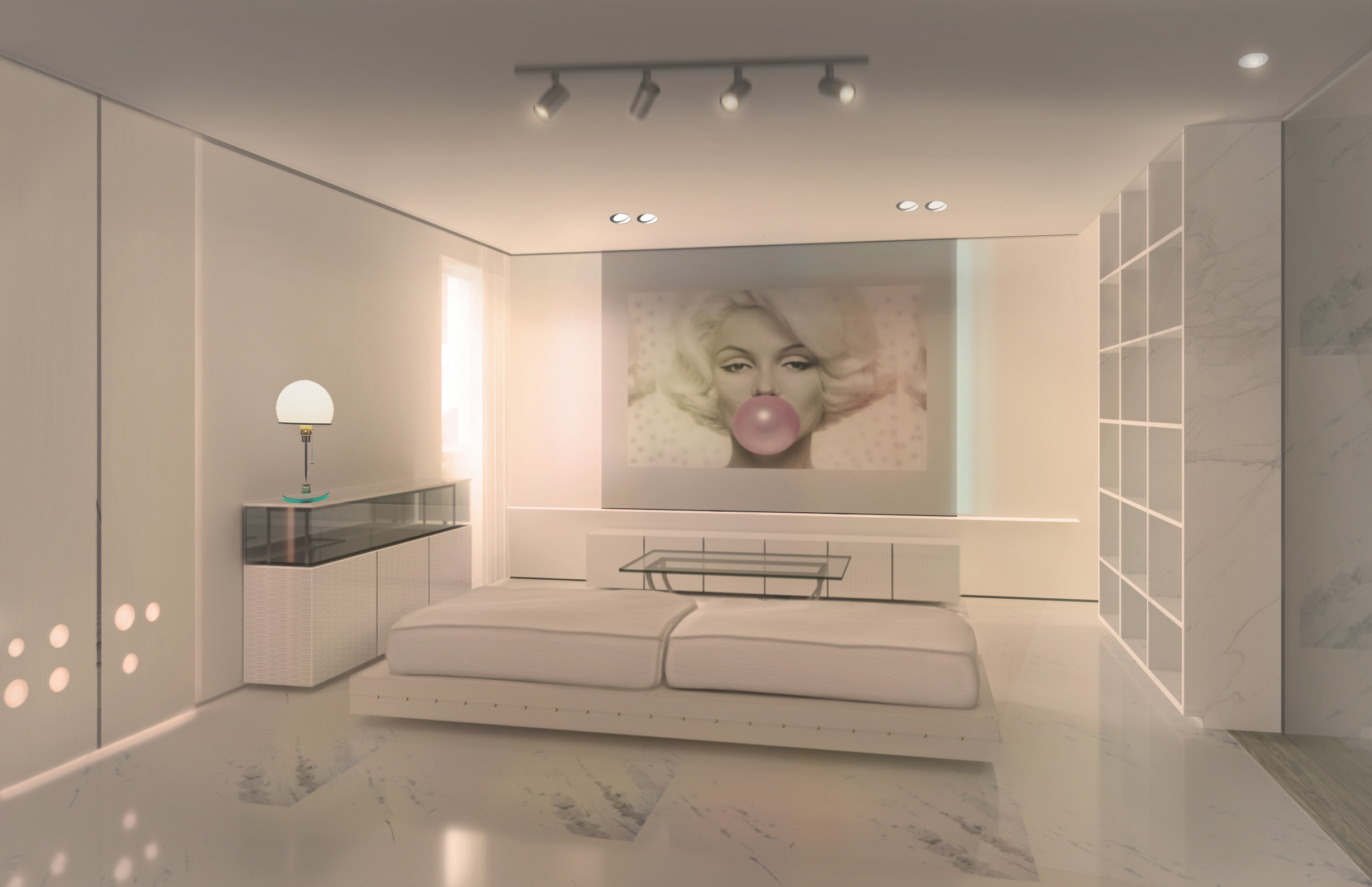 Durante o dia o espaço vive da presença da luz diurna. A luz natural com o raiar do dia adentra o espaço distribuindo-se uniformemente de forma suave, criando no interior uma atmosfera de bem estar e de conforto. À noite através da iluminação artificial, cria-se um lugar calmo propício para o relaxamento e para o descanso.