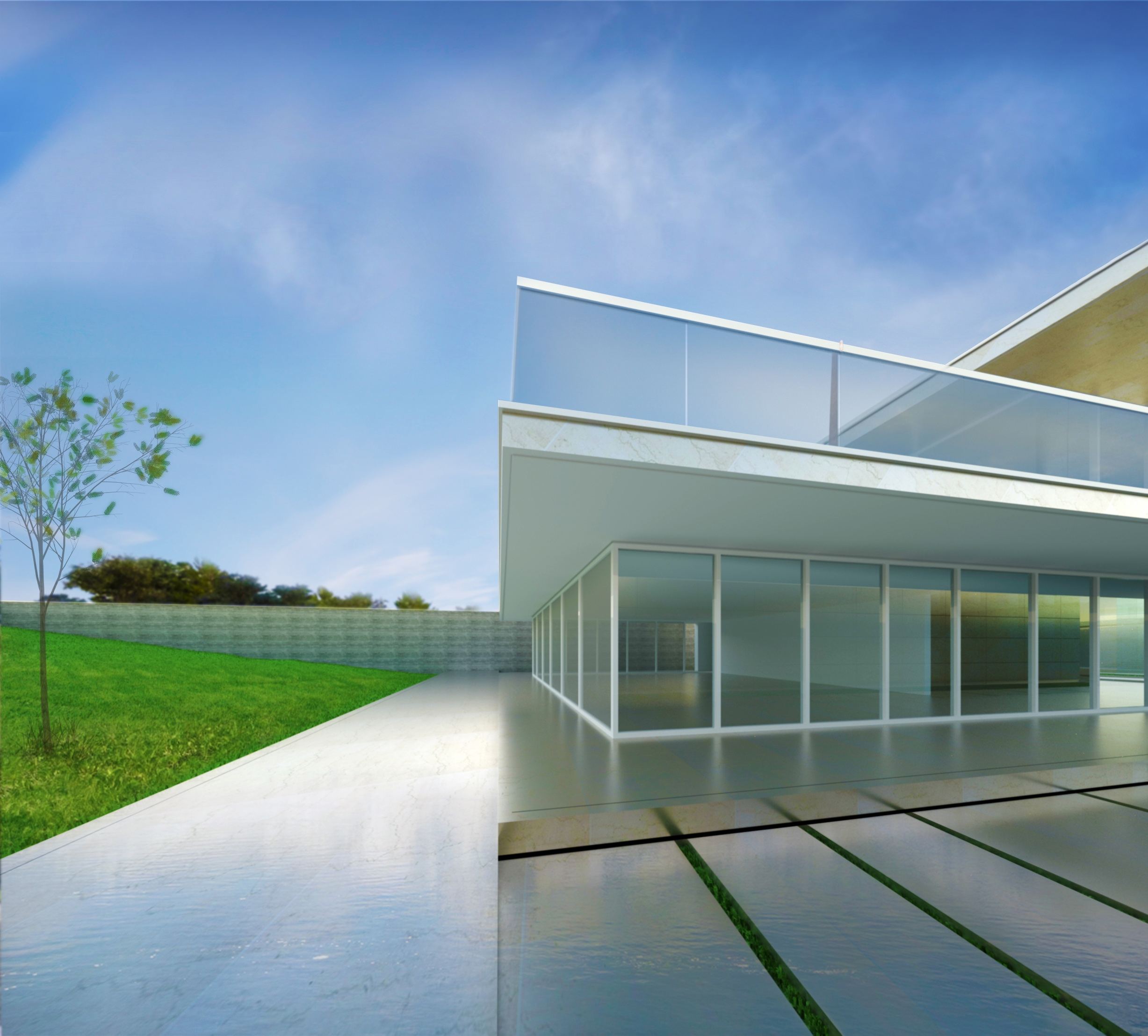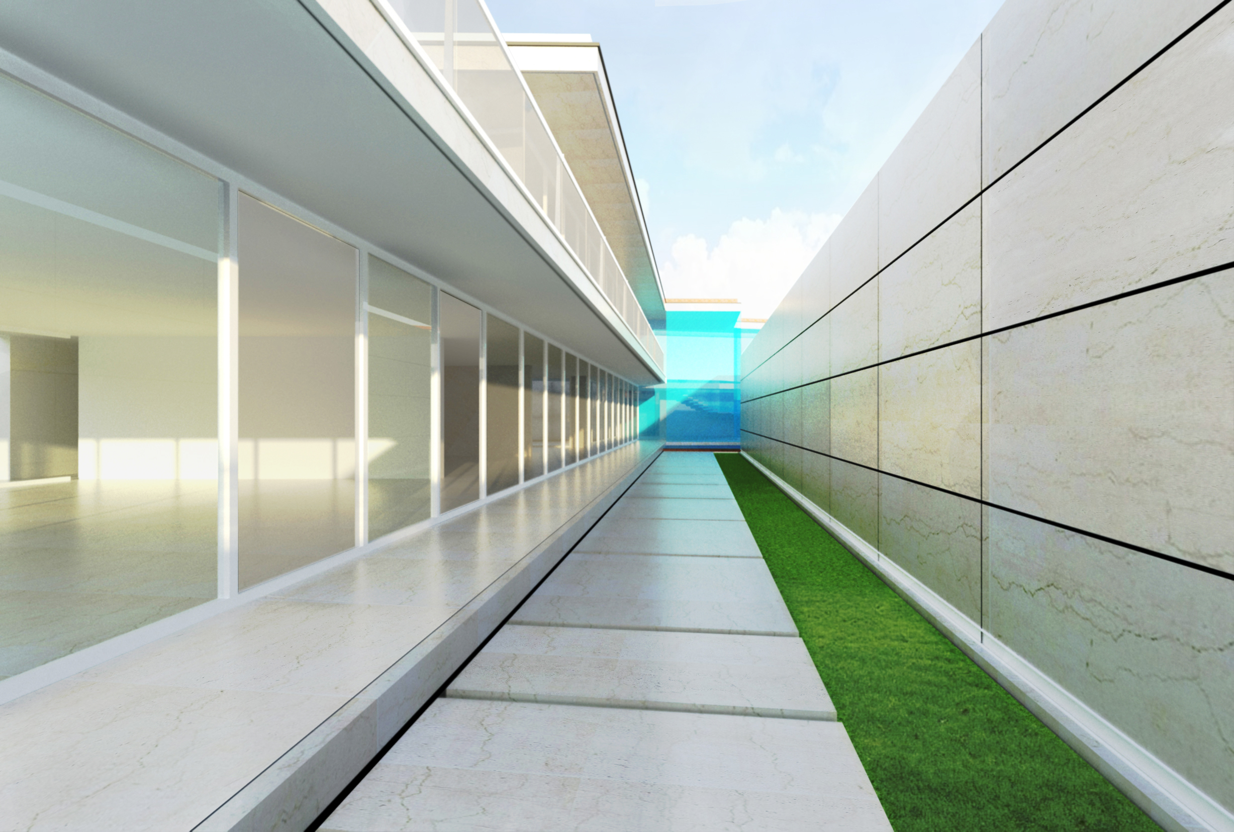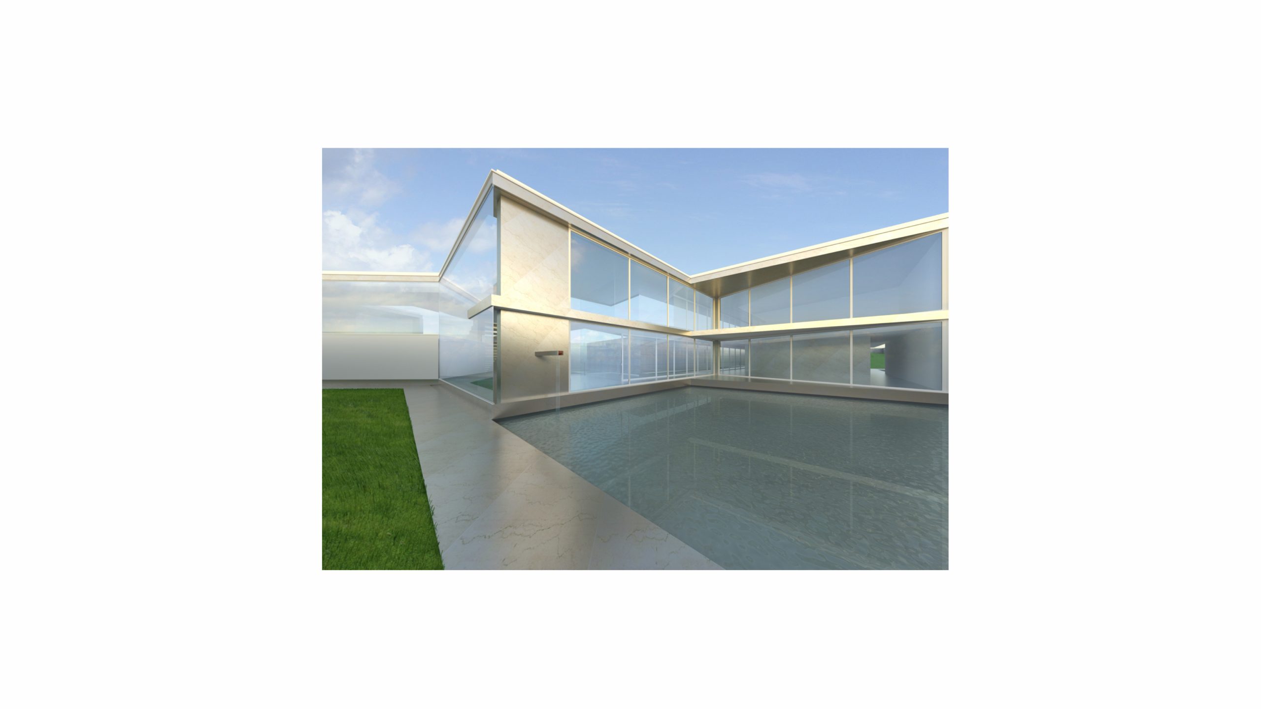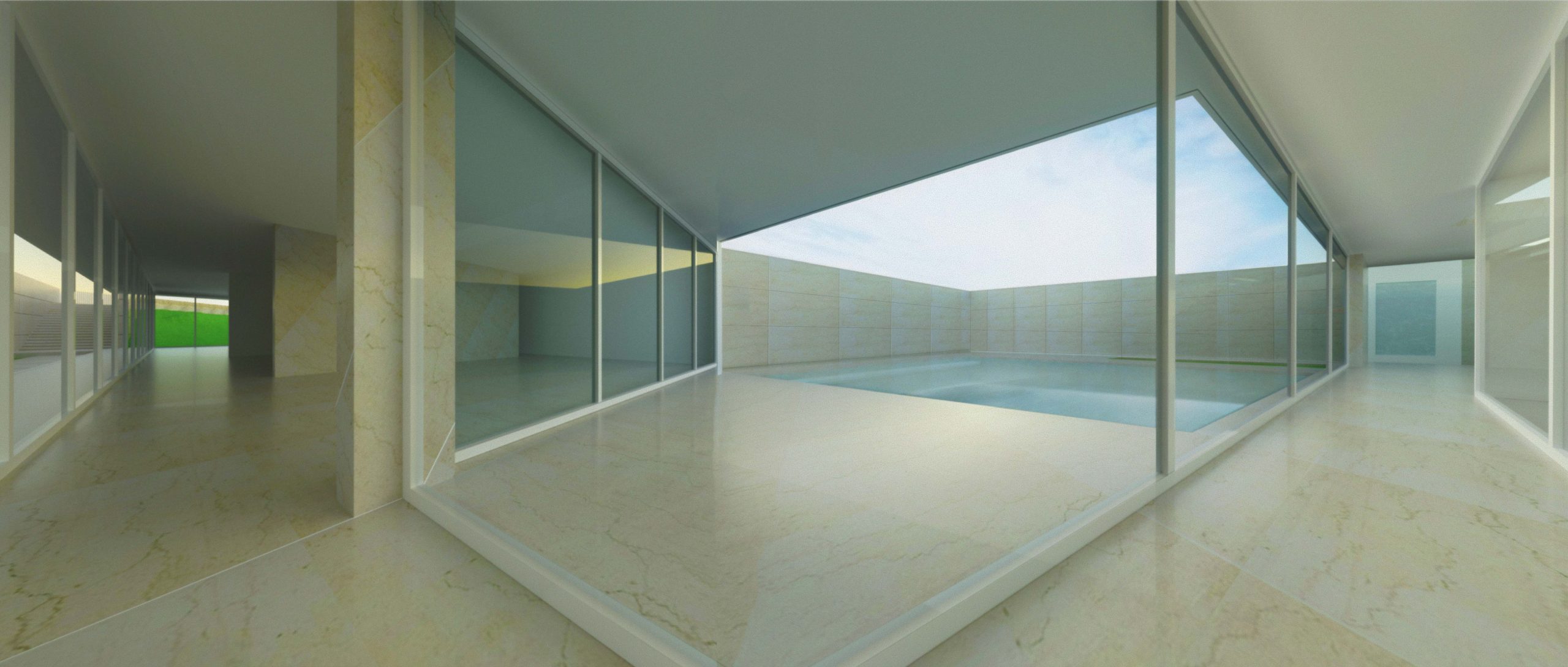 O interior abre-se para o exterior pela transparência das fachadas em vidro, e usufrui da presença de um jardim continuo que se molda de acordo com funcionalidade de cada espaço.