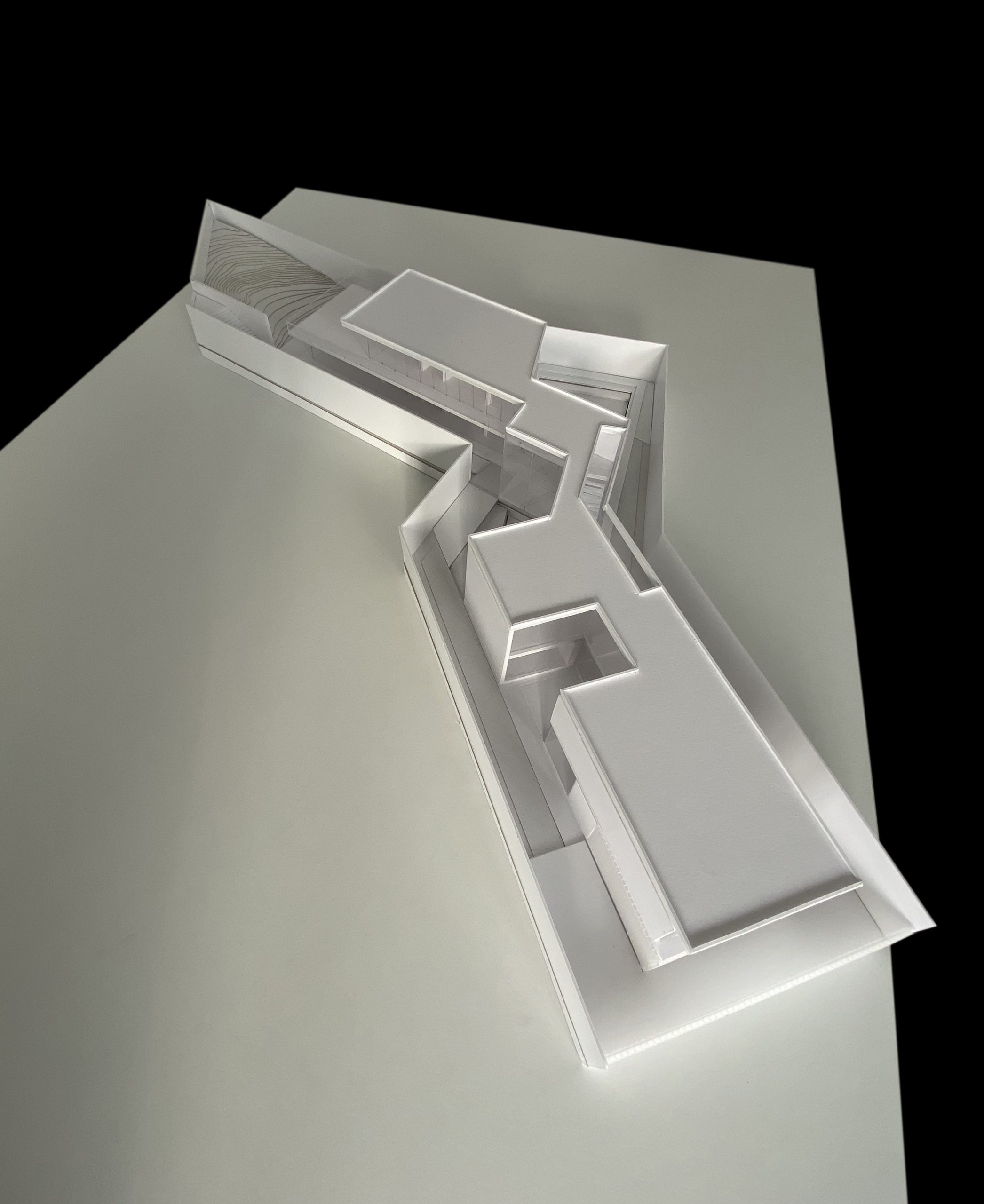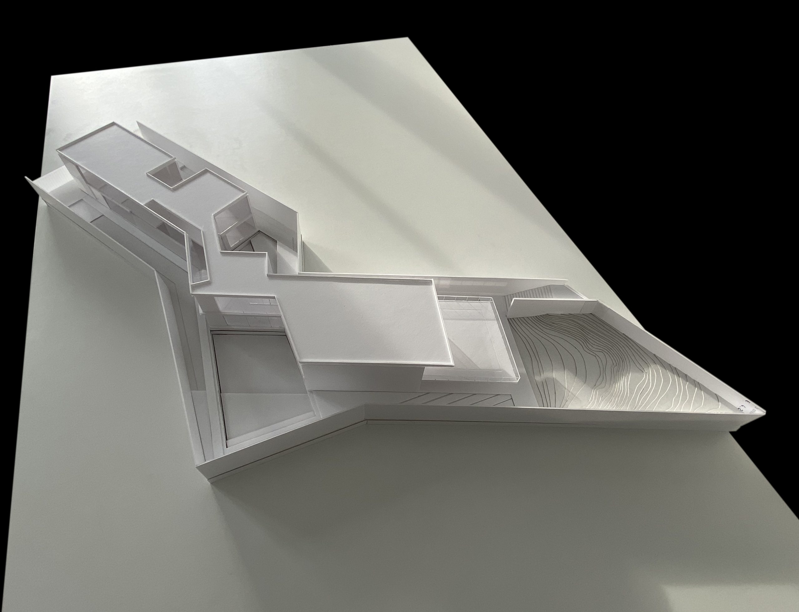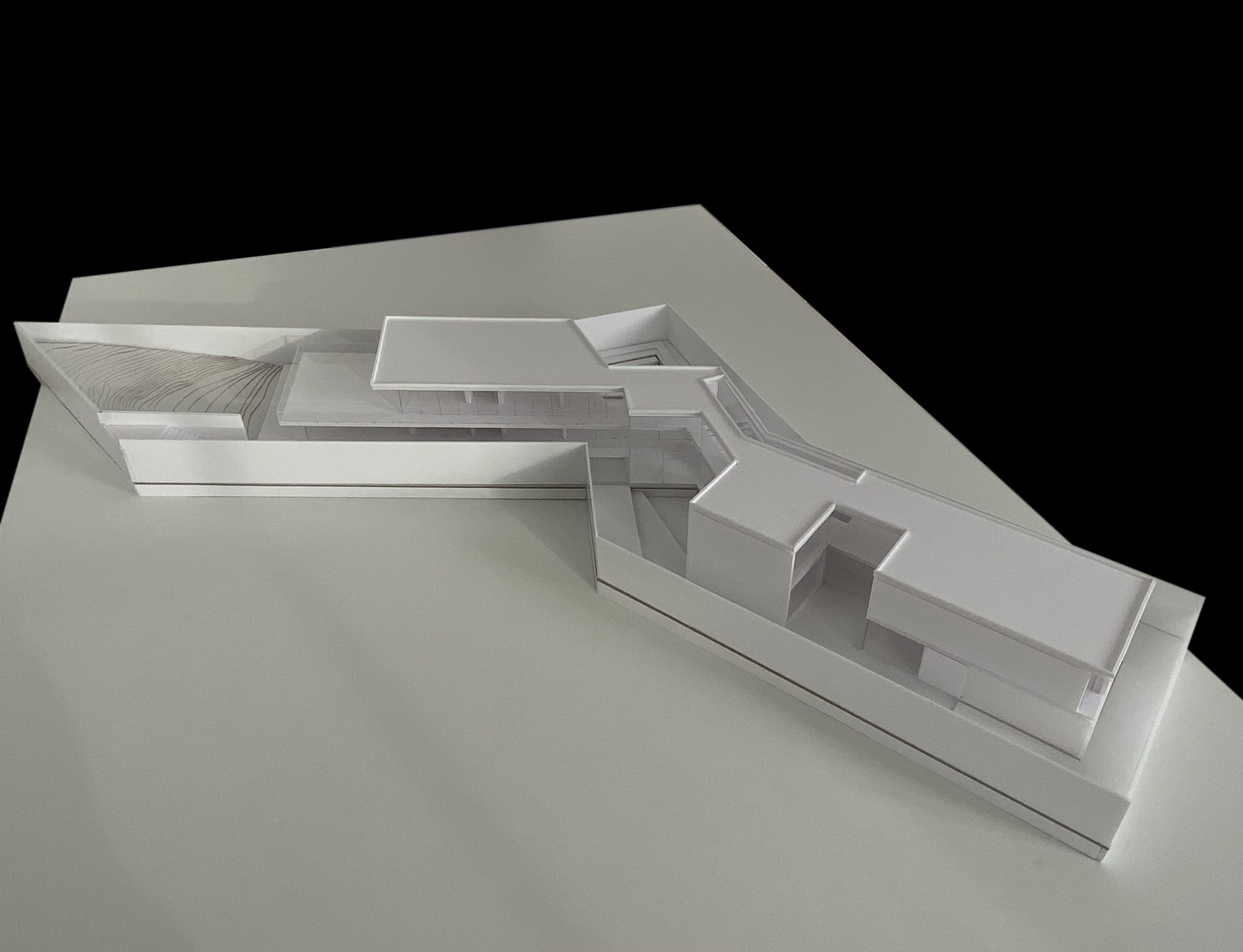 Assim, com naturalidade a volumetria nasce da morfologia do terreno. A proposta surge em parte como resultado dessa análise, especificamente da configuração do lote, e da sua relação com a envolvente.