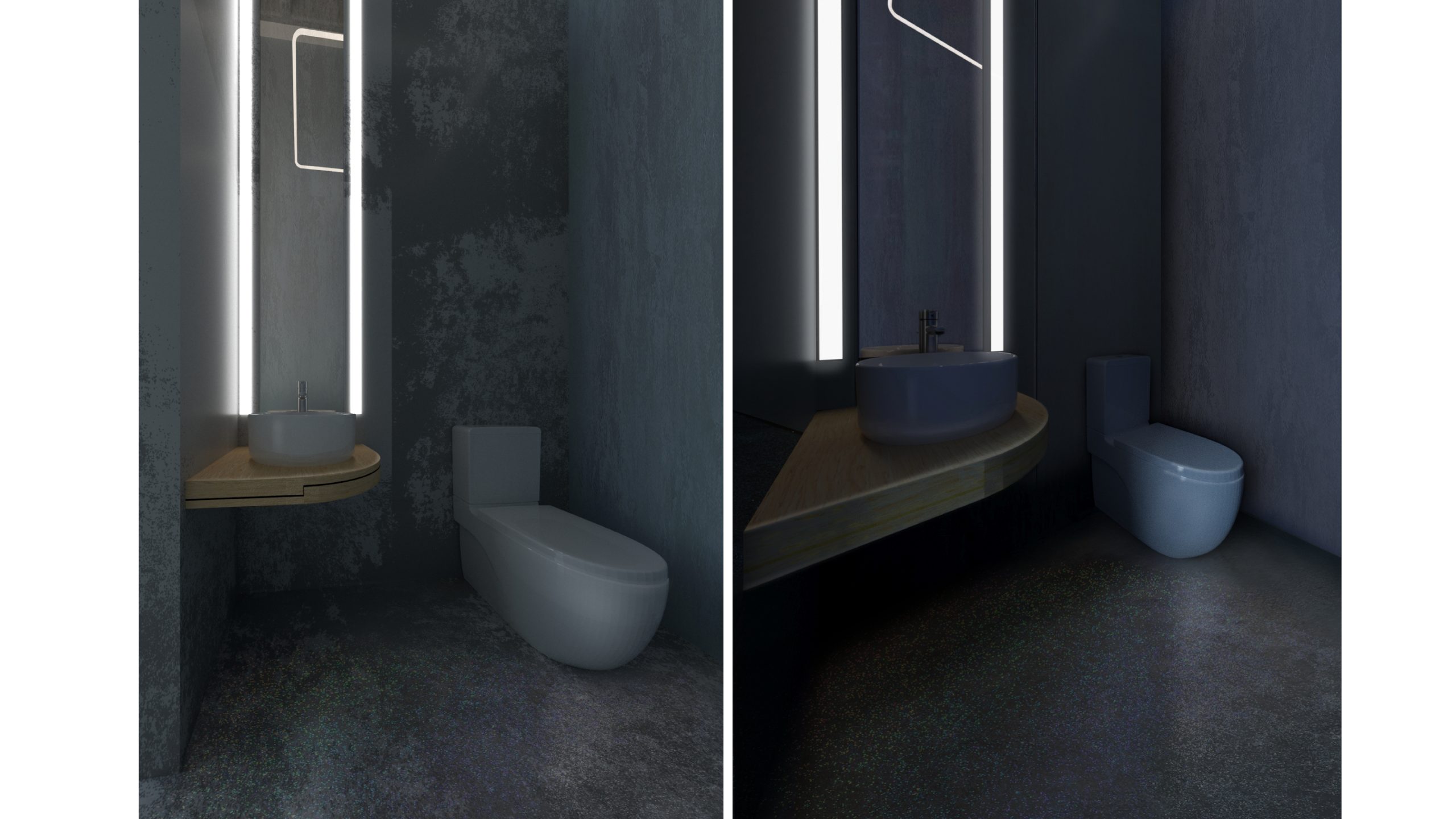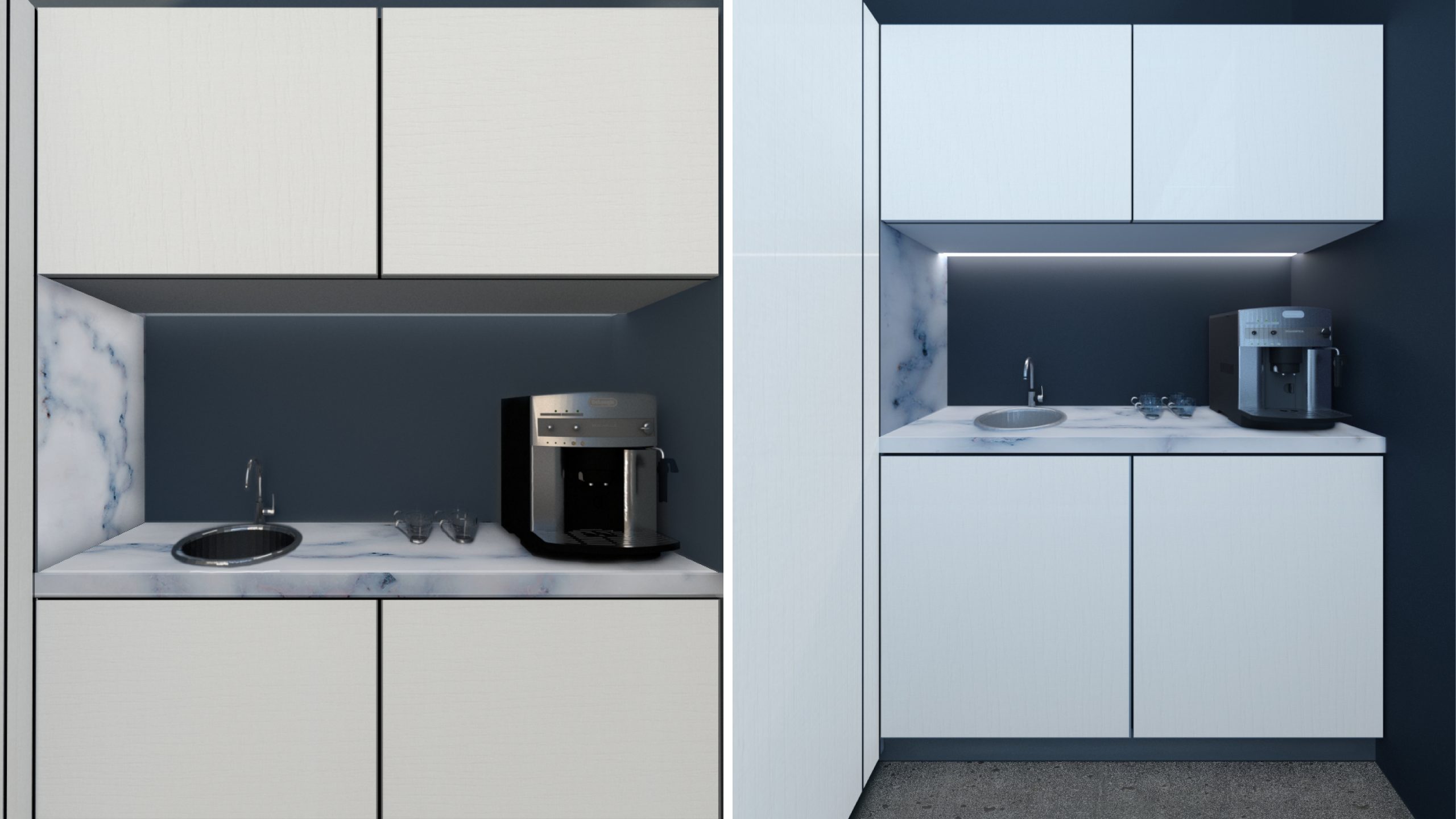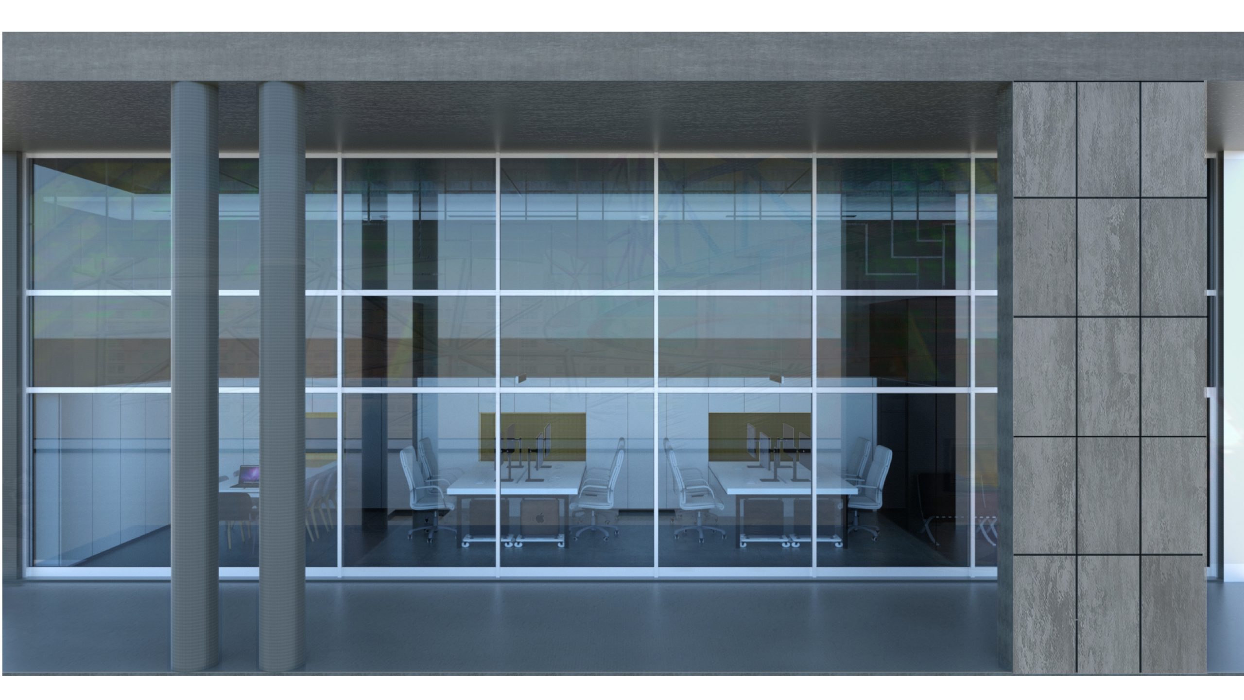 O layout do espaço organiza-se através de dois planos transparentes em vidro, que seccionam e dividem o espaço. A transparência deste material permite que o espaço surja como um todo.