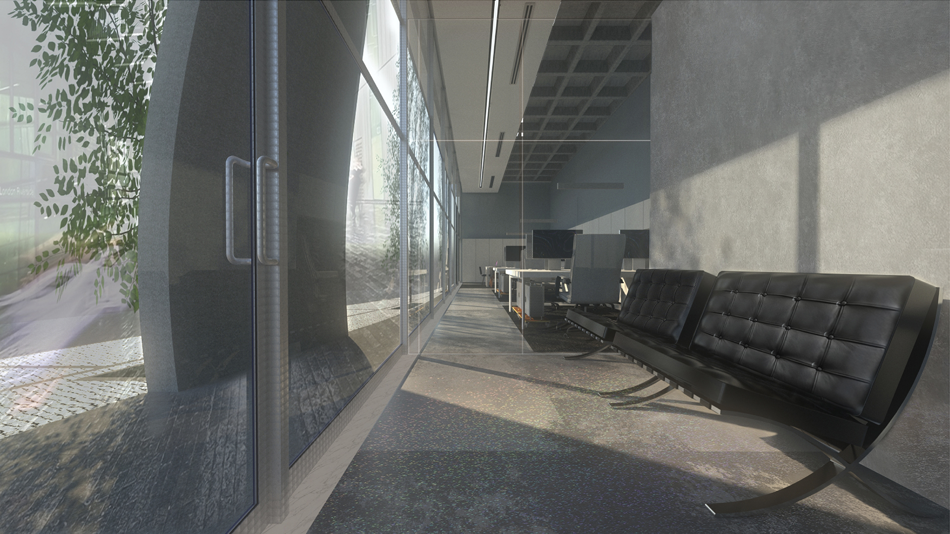 Através do envidraçado da fachada revela-se o fluxo do movimento urbano exterior que cria no interior uma sensação de ritmo.